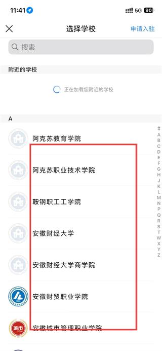 2、进入选择学校页面,找到自己所在的学校并点击选择。