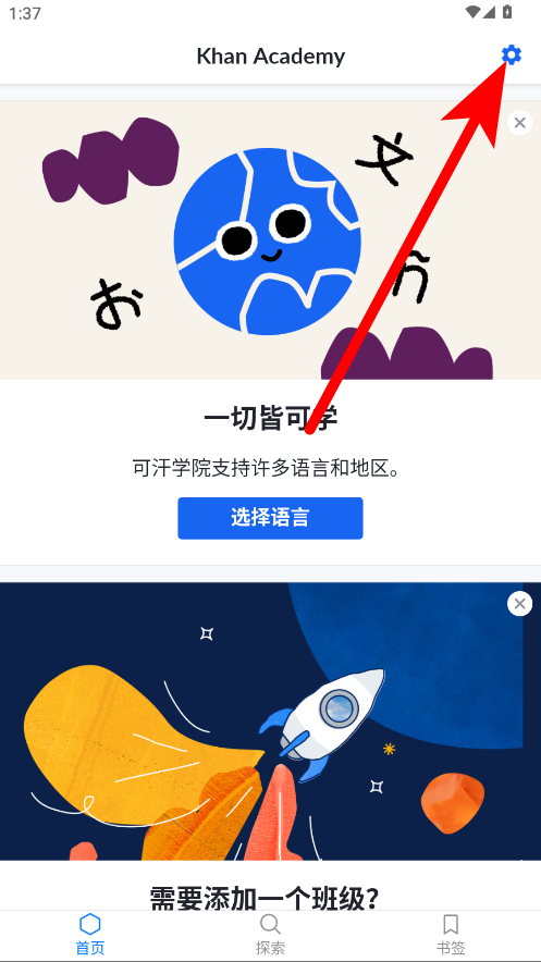 1、在可汗学院首页,点击右上角设置图标,进入设置页面。