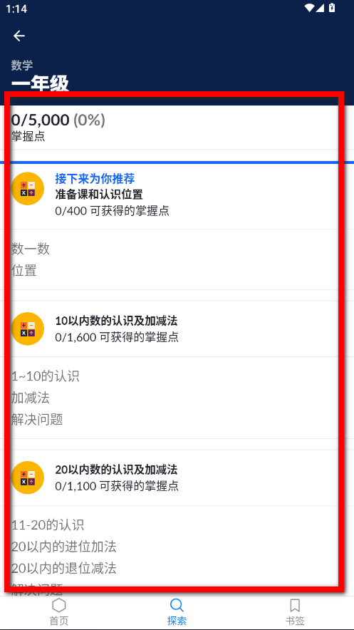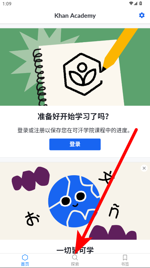 1、在可汗学院首页,点击底部探索选项,进入探索页面。