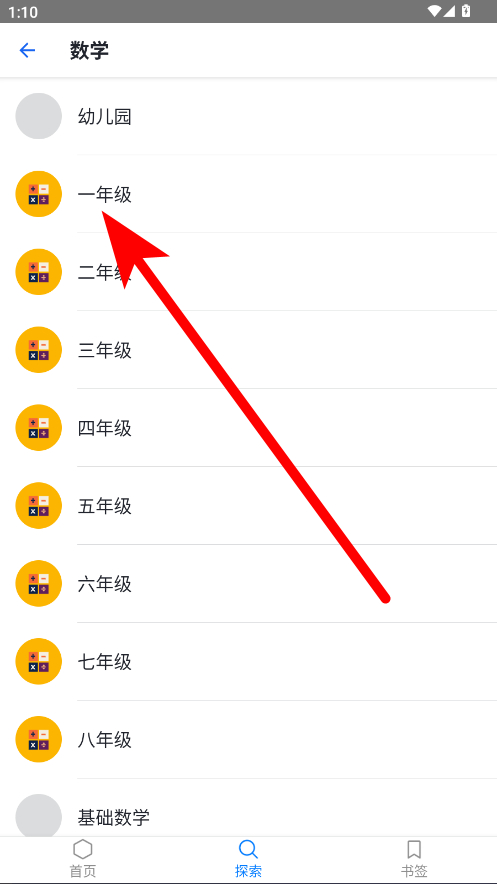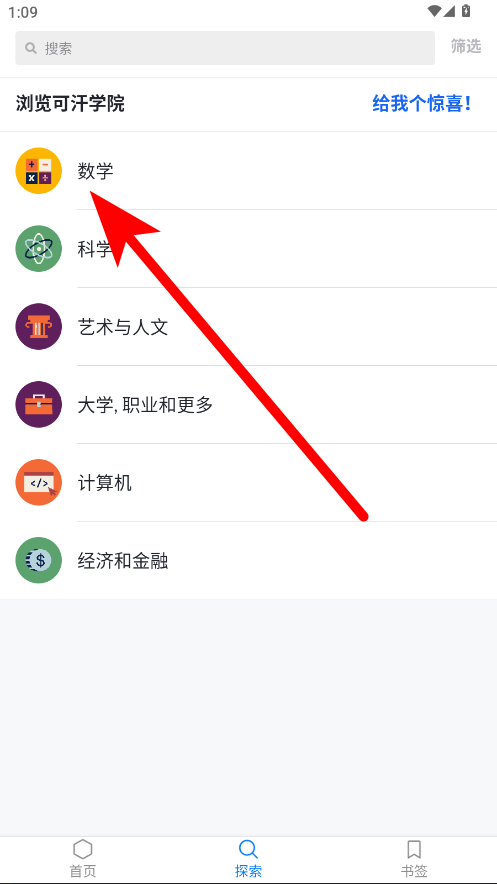 2、在探索页面,选择要学习的学科类别,比如数学,进入学科页面。