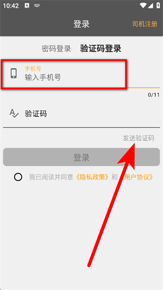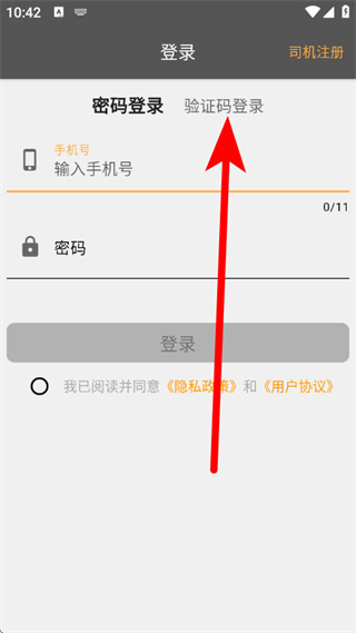1、打开风韵城际司机版,在登录页面,点击验证码登录。