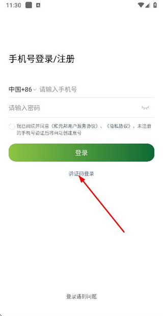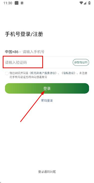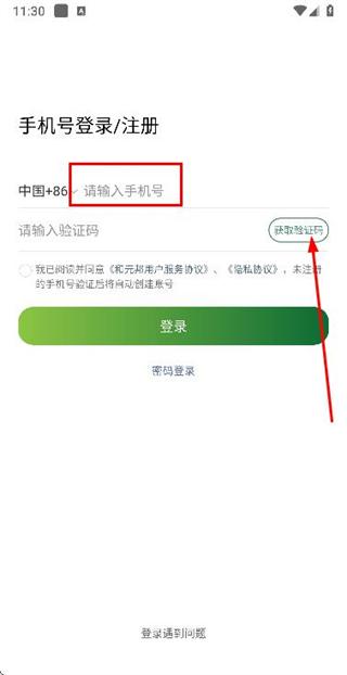 2、在验证码登录页面填写手机号,勾选协议后,点击获取验证码。