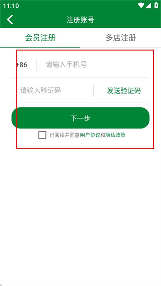 2、在注册账号页面,填写手机号、验证码并勾选协议后,点击下一步。