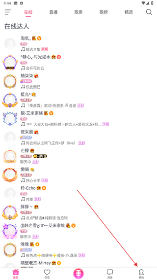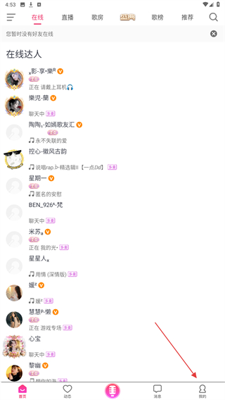 1、启动爱唱的应用APP,进入首页点击右下角我的图标。