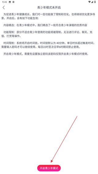 4、进入青少年模式的页面内,了解后点击开启青少年模式即可。