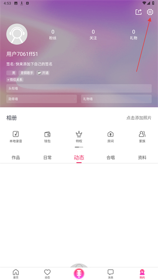 2、进入我的页面内,点击右上角设置的功能按钮。