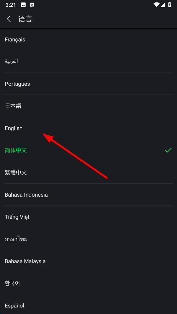 3、在语言设置页面,选择想要切换的语言,例如点击English。