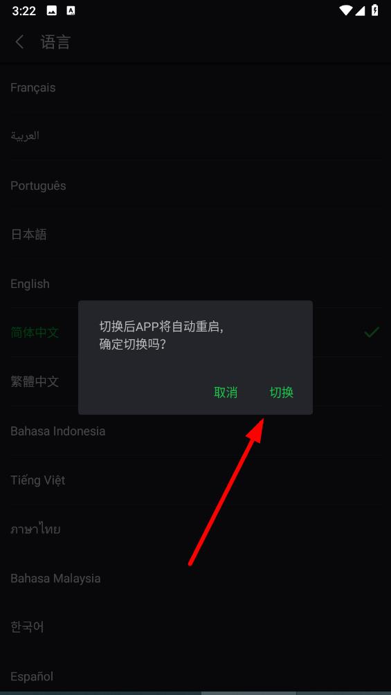 4、在弹出的确认提示框中,点击切换按钮,APP会自动重启,重启后语言设置即切换完成。