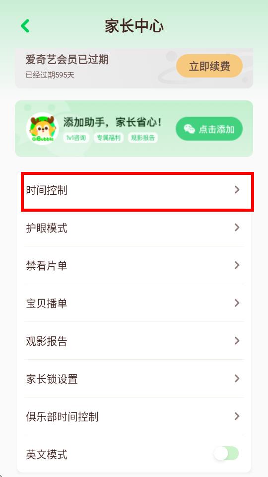 2、在家长中心众多选项里,找到时间控制点击进入时间控制设置界面。