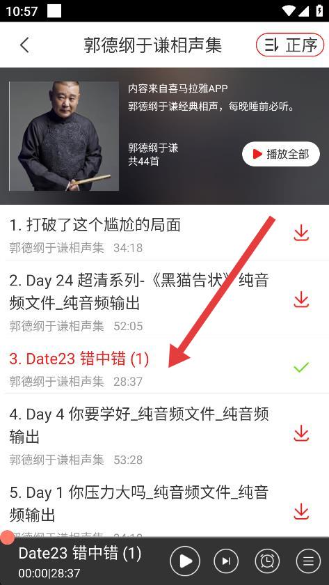 4、进入专辑页面后,选择具体的相声节目,点击即可播放收听。