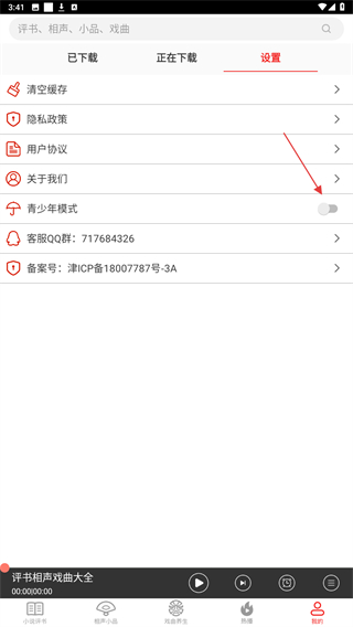 3、在设置页面找到青少年模式的选项,点击右侧的开关按钮。