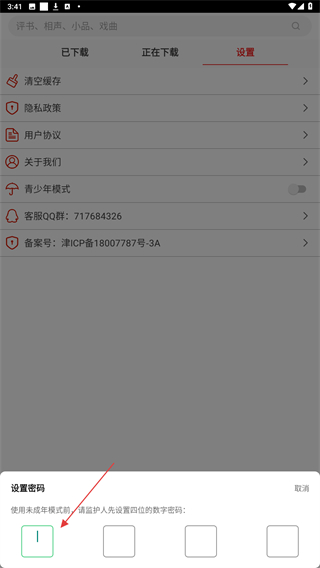 4、弹出设置密码窗口后,输入四位数字密码,完成青少年模式的开启。