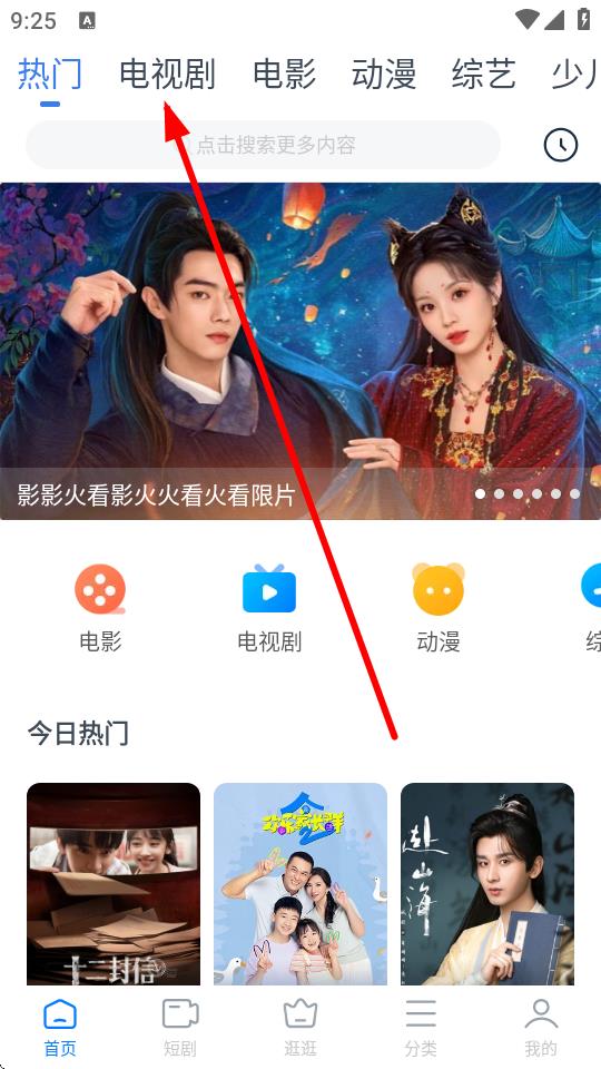 1、在影视大全首页,点击顶部电视剧选项,进入电视剧分类页面。