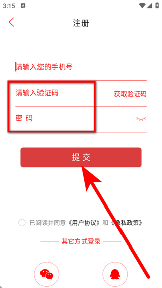 5、在注册页面,输入验证码、设置密码,点击提交,完成注册。