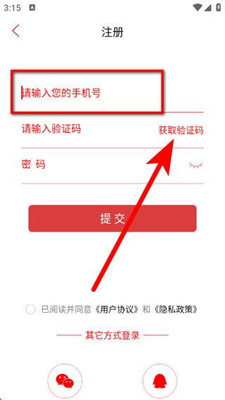 4、在注册页面,输入您的手机号,点击获取验证码。