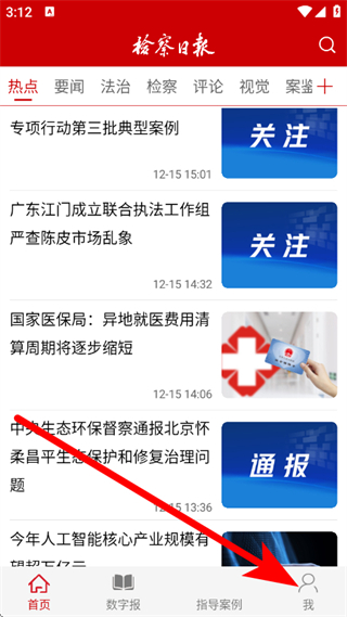 1、打开检察日报电子版,点击底部我,进入个人页面。