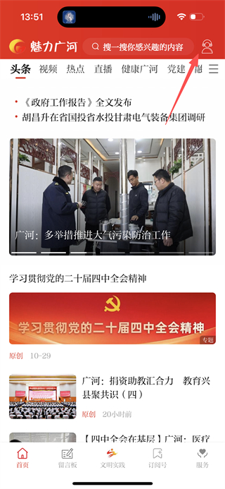 1、在魅力广河首页,点击右上角的头像图标,进入个人中心页面。