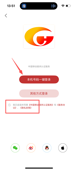 3、在登录页面,勾选协议后点击本机号码一键登录,完成账号登录操作。