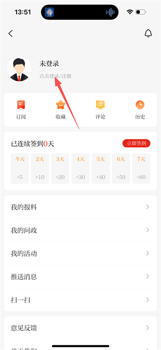 2、在个人中心页面,点击点击登录注册区域,进入登录页面。