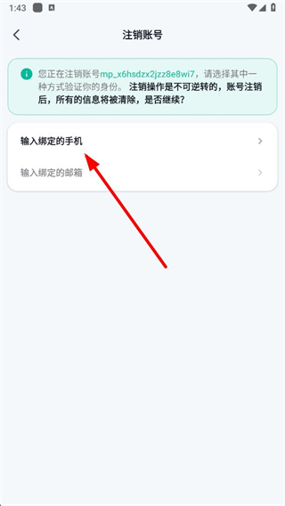 4、在注销账号页面选择输入绑定的手机或输入绑定的邮箱进行身份验证,完成验证后即可注销账号。