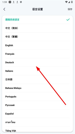 4、在语言设置页面,选择目标语言,点击右上角保存按钮,即可完成语言设置修改。