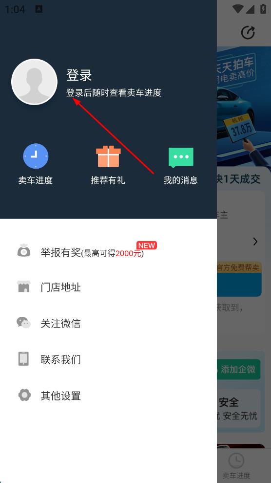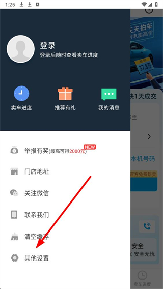 1、在天天拍车应用界面,点击左上角图标,展开侧边功能栏。