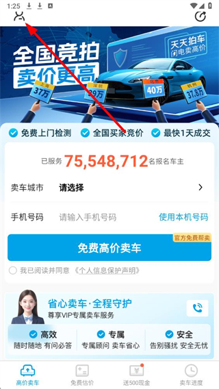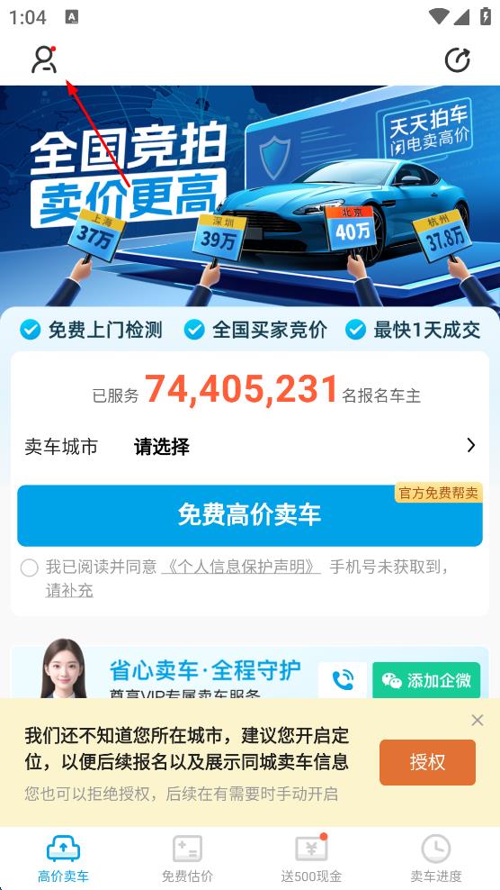 1、打开天天拍车App,点击页面左上角的个人图标。