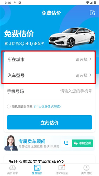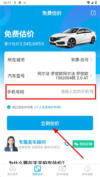 5、输入手机号码,勾选已阅读并同意个人信息保护声明后,点击立刻估价按钮,即可完成免费估价操作。