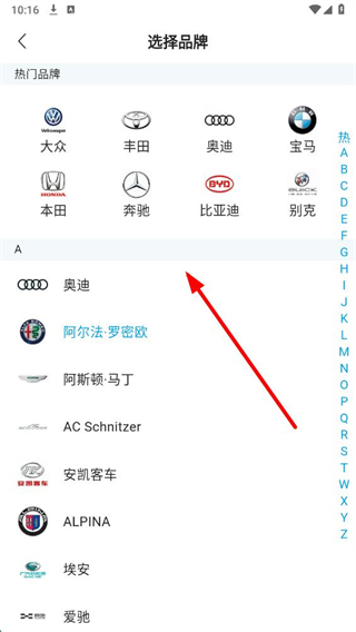4、点击汽车型号选项,进入选择品牌页面后选择汽车品牌和具体型号。