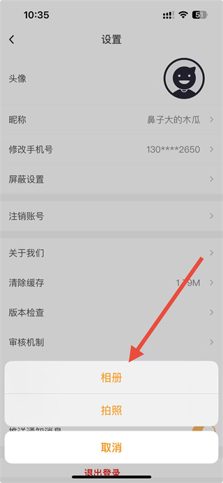 4、在选择菜单中选择相册或拍照方式,选择图片后即可完成头像修改。