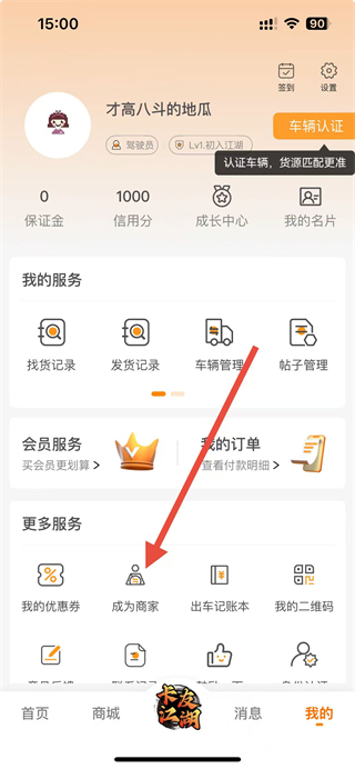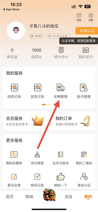 1、打开卡兄卡弟app,在我的页面点击车辆管理选项,进入车辆管理页面。