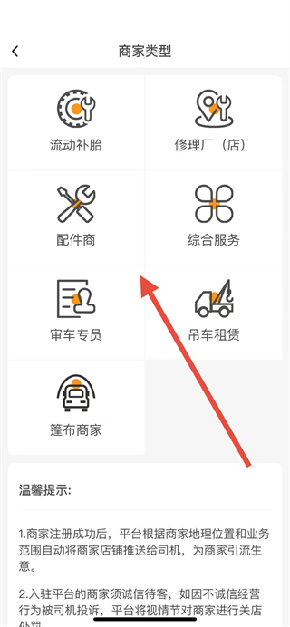 4、进入商家类型页面后,选择对应的商家类型,按照提示完成注册即可加入商家开店。