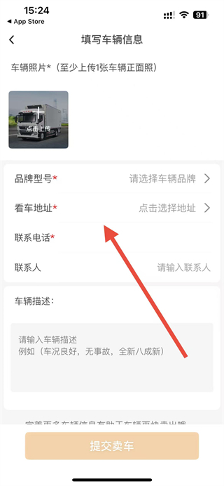 3、在填写车辆信息页面,上传车辆照片,选择品牌型号等信息,点击提交卖车按钮完成二手车发布。