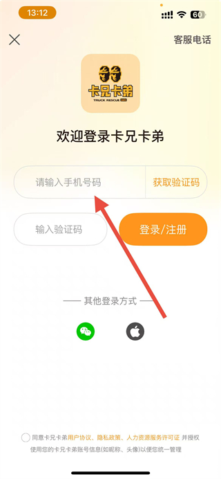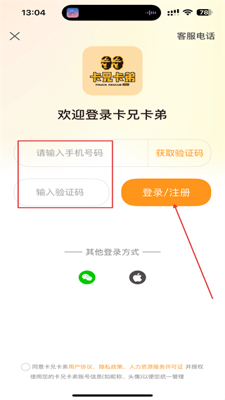 3、输入手机号码、验证码后,点击登录/注册的按钮即可。