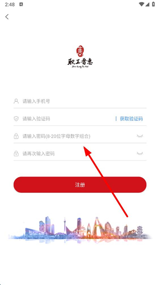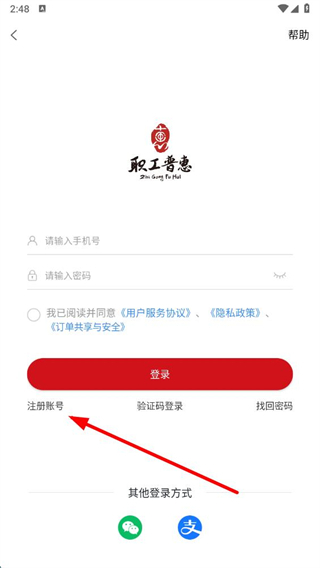 4、在注册页面,输入手机号、验证码及密码,点击注册完成账号注册。