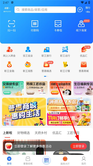 1、在职工普惠app推荐页面,点击立即登录进入登录页面。