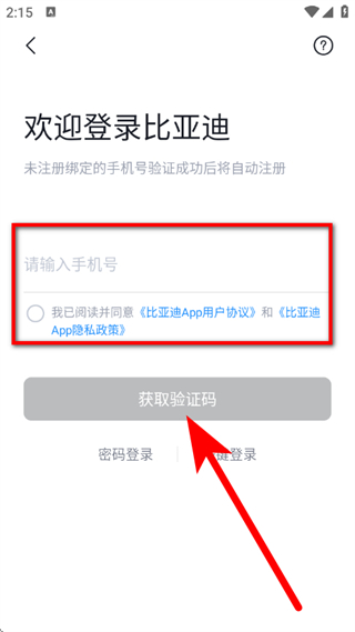 3、在欢迎登录比亚迪页面,输入手机号,勾选协议后,点击获取验证码。