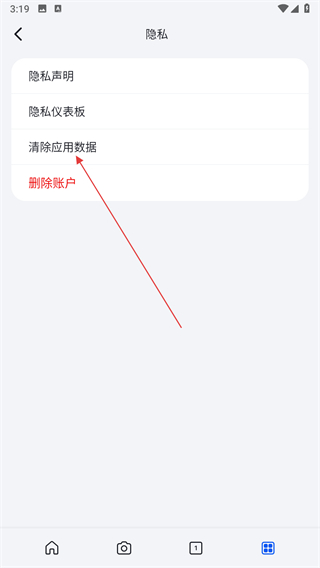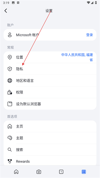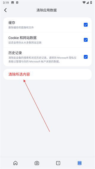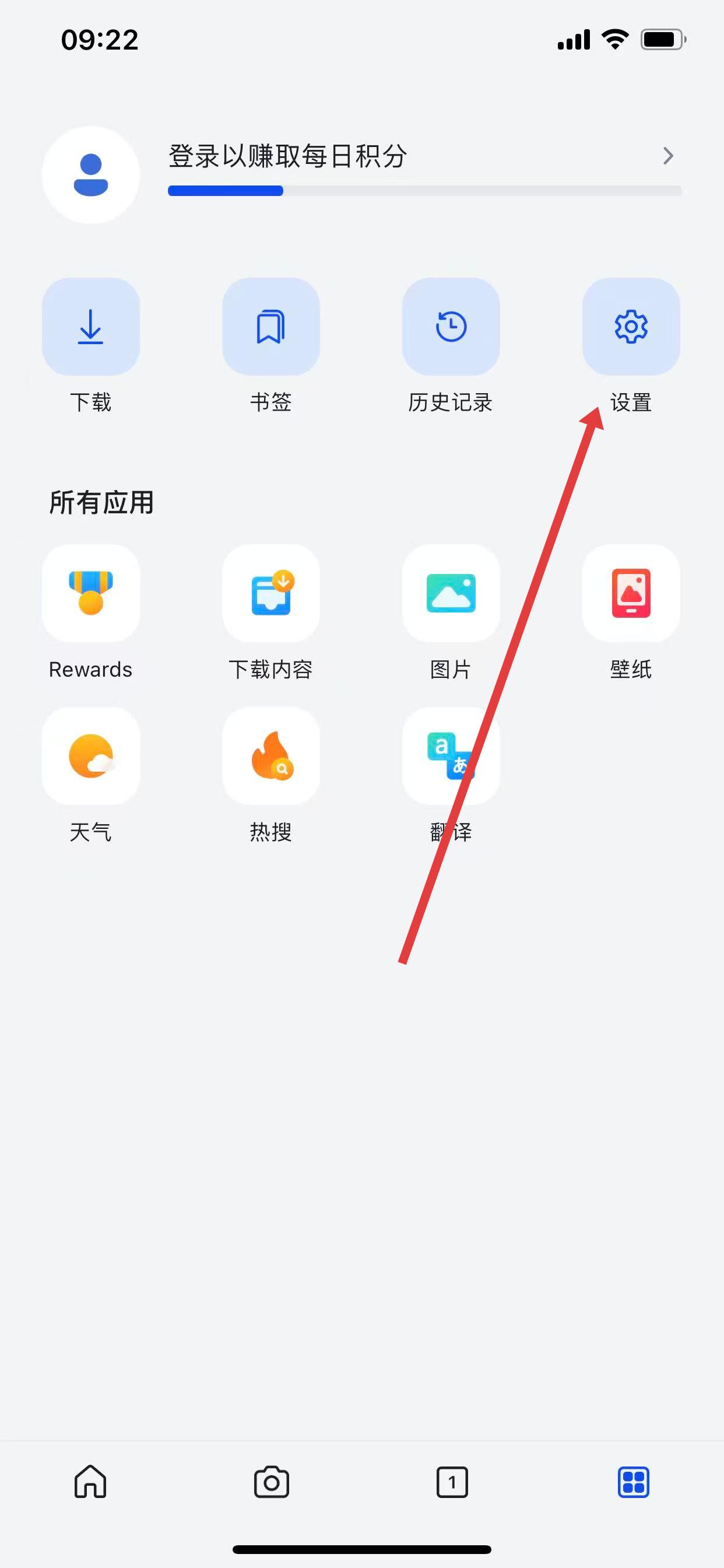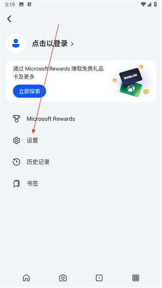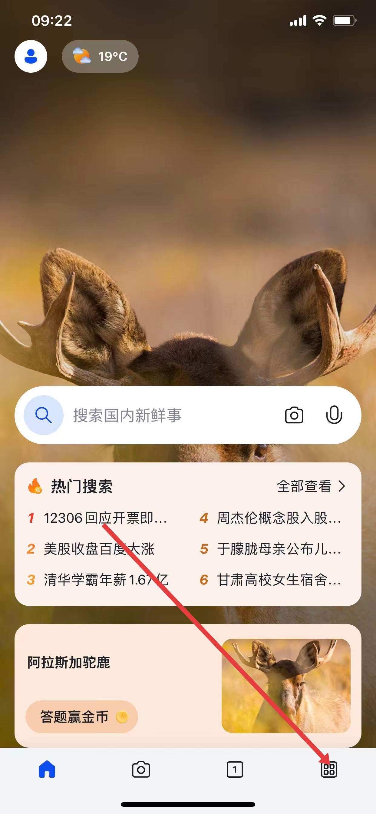 1、打开微软必应应用,点击底部导航栏右侧的九宫格图标。