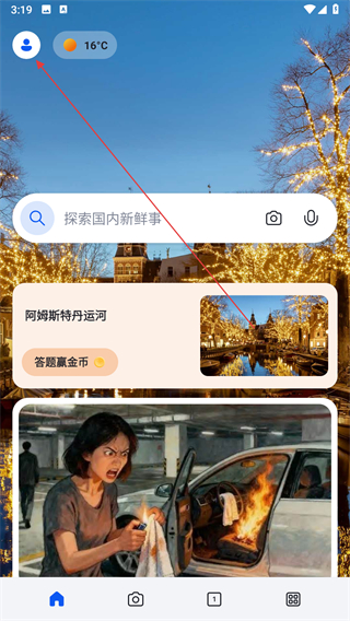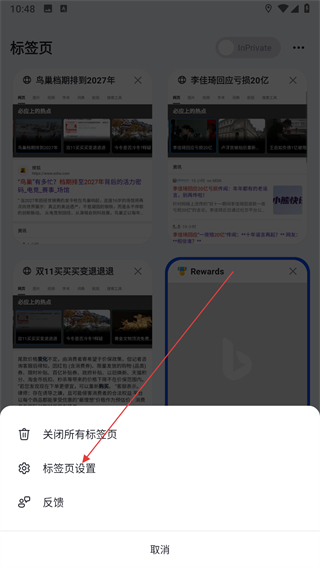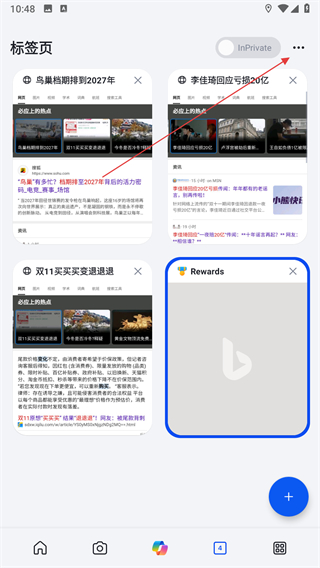 1、打开必应搜索应用,在标签页界面点击右上角的三点图标。