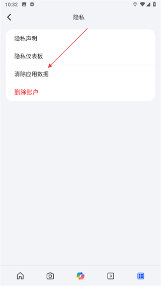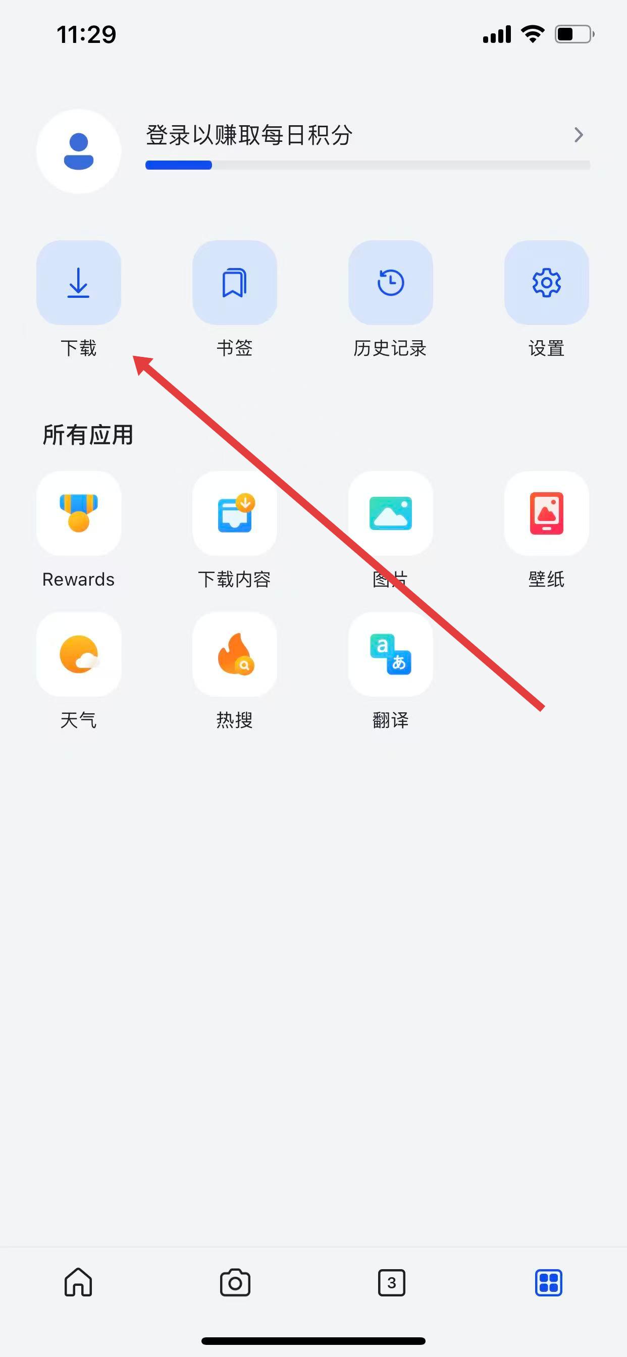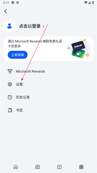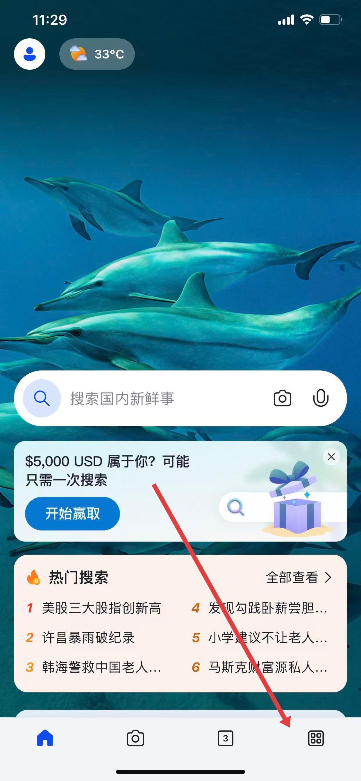 1、打开微软必应应用,点击底部导航栏最右侧的九宫格图标,进入功能菜单界面。