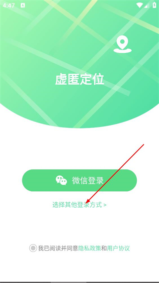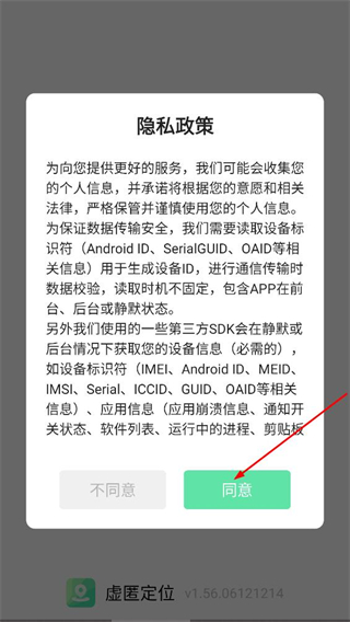 1、在虚匿定位的隐私政策弹窗中,点击同意,进入登录页面。