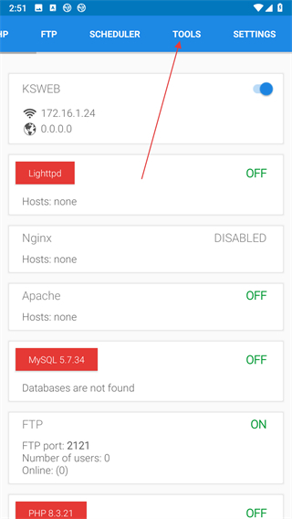 1、打开KSWEB开源服务器应用,找到顶部导航栏中的TOOLS选项并点击。