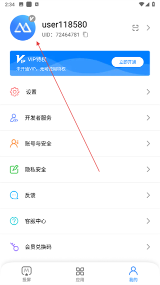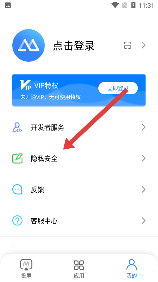 1、打开傲软投屏点击底部导航栏的我的,进入个人中心页面,找到并点击隐私安全选项。