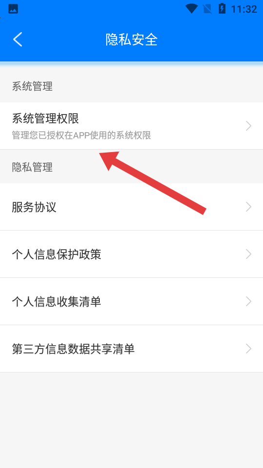 2、在隐私安全页面,点击系统管理权限选项,进入系统权限管理界面。