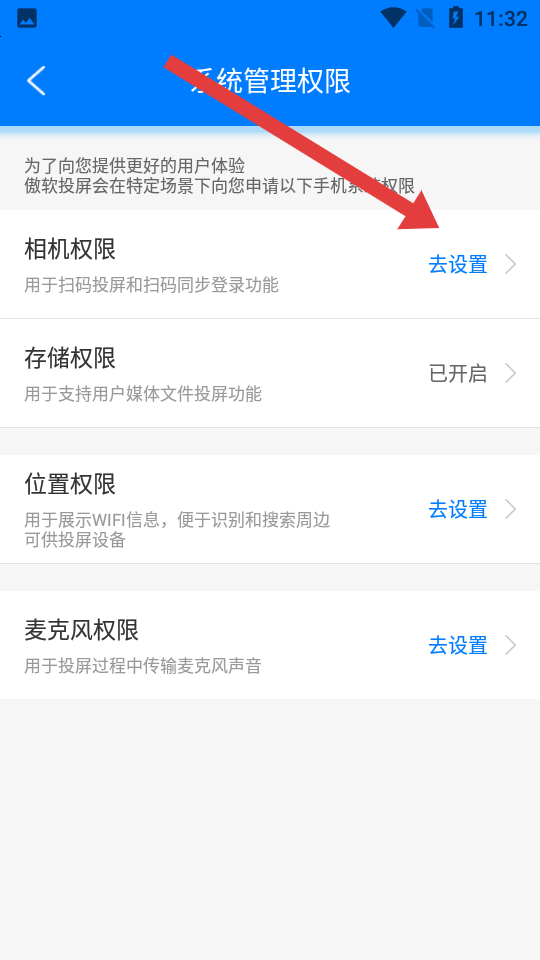 3、在系统管理权限页面,找到相机权限选项,点击去设置按钮,进入应用信息页面。
