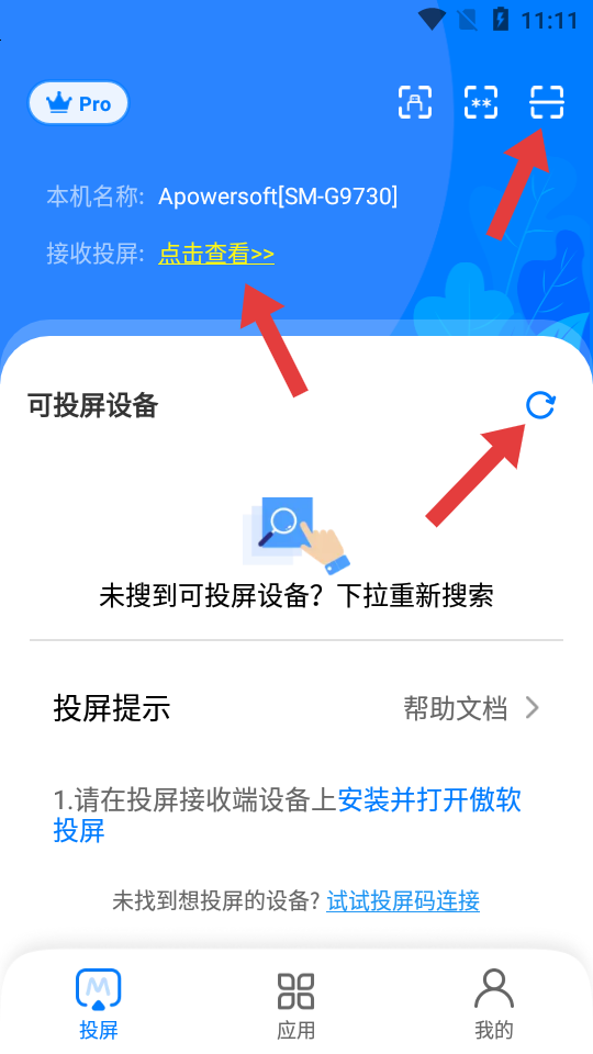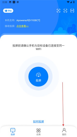 1、如果想要投屏,可以选择主界面点击接收投屏点击查看、循环图标或着右上角的扫码图标。