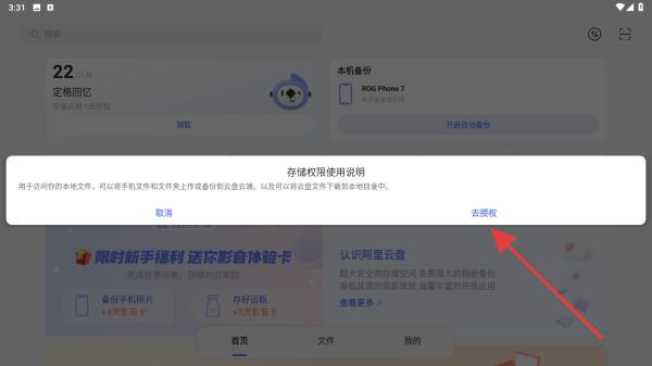 2、若弹出存储权限使用说明,点击去授权,跳转系统设置页,允许阿里云盘访问全部文件/媒体文件。