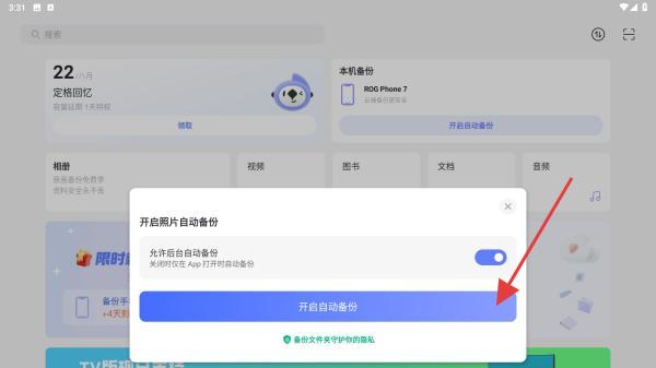 3、授权后,回到APP,在开启照片自动备份弹窗中,确认开启自动备份,可提前打开允许后台自动备份开关,保持默认也可。