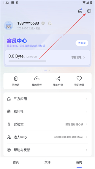 1、打开阿里云盘应用,点击右上角的设置图标。