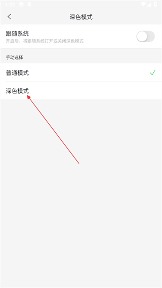 4、在深色模式页面,点击深色模式选项即可开启。